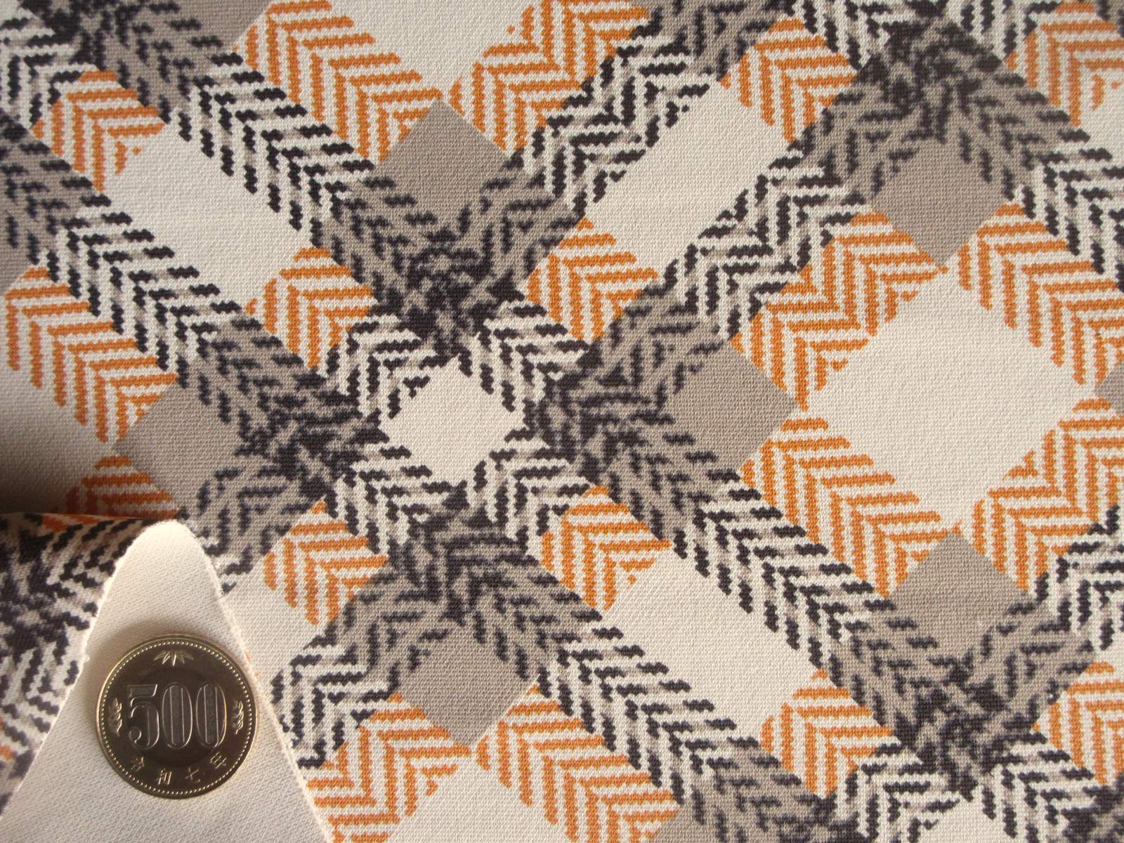 ダンボールプリントニット(アーガイル柄) オレンジx茶系 140cm巾 ポリエステル100% 伸縮性・肉厚は普通 スウェットに使用可 (表示価格は、1mの価格です)