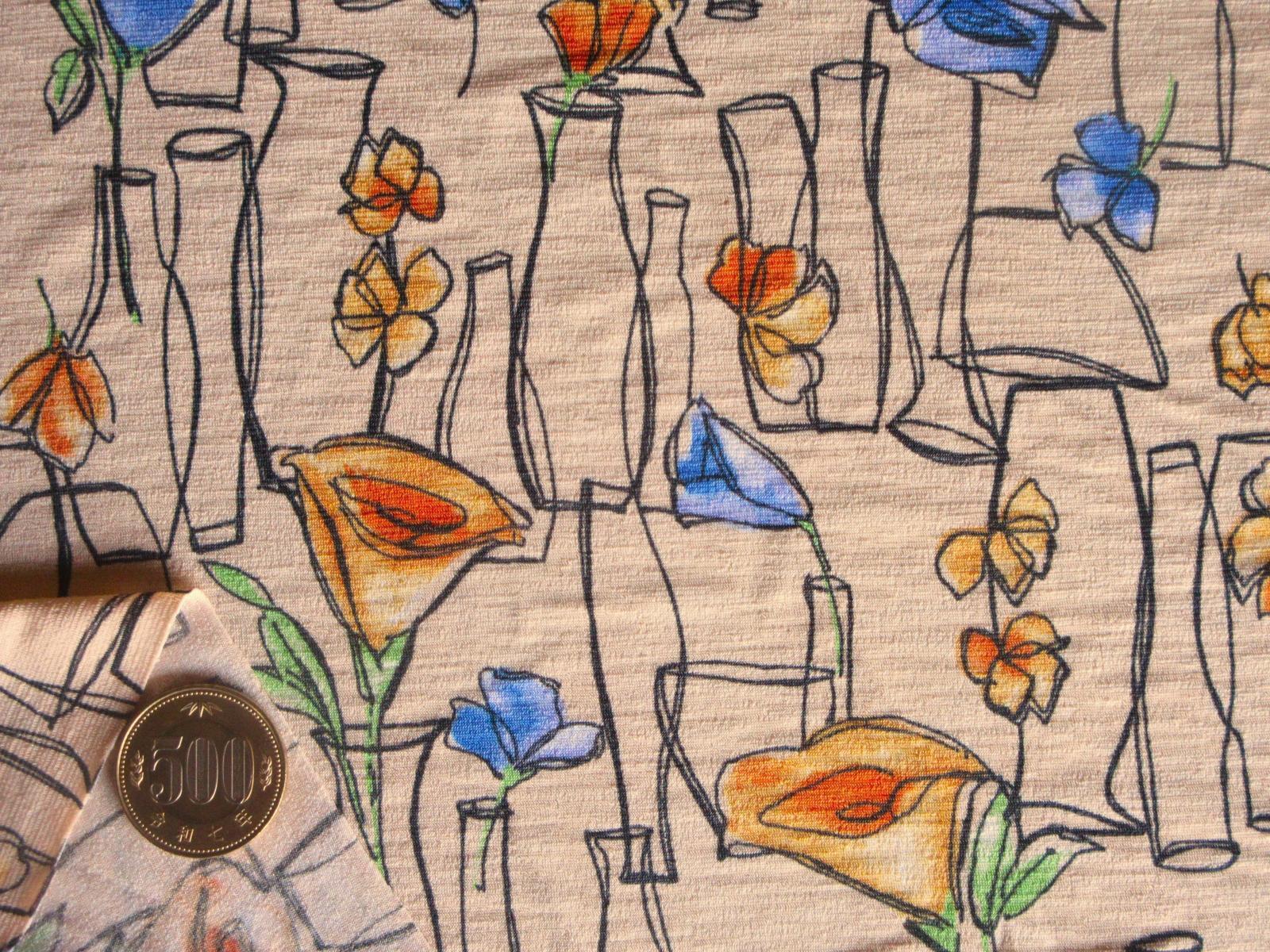 ストレッチT・プリントニット ベージュxパープル系 108cm巾 ポリエステル95%ポリウレタン5% ややうす手 伸縮性・縦横によく伸びる シャリ感あります (表示価格は、1mの価格です)